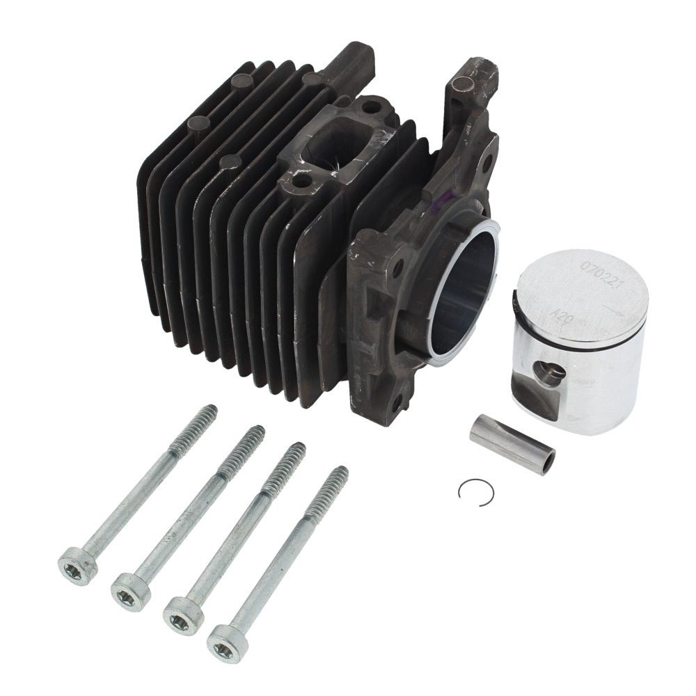 Zestaw składa się z trwałego cylindra z odlewanego aluminium z precyzyjnie obrobionym otworem oraz dopasowanego tłoka, co gwarantuje idealne uszczelnienie i przywraca fabryczną kompresję silnika. Jest to bezpośredni zamiennik, który pomoże wyeliminować problemy z trudnym rozruchem, utratą mocy i niestabilną pracą na biegu jałowym, spowodowane zużyciem lub zatarciem starego zestawu.