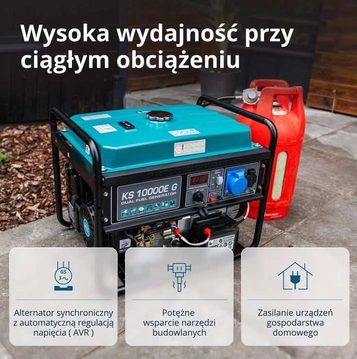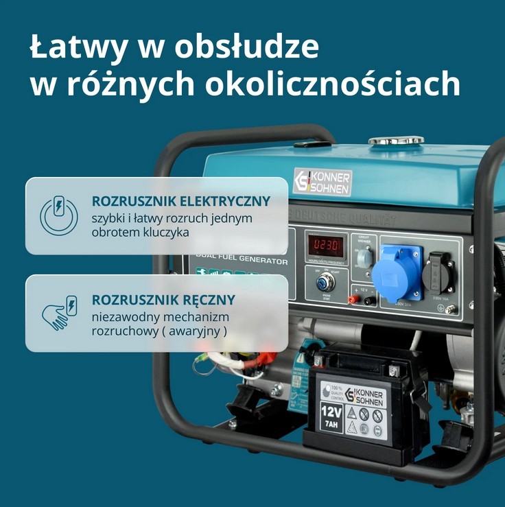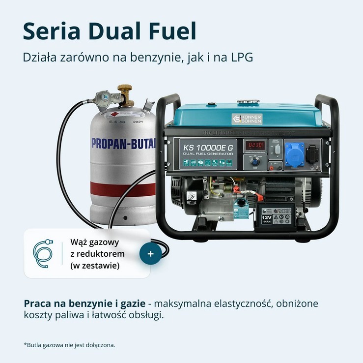 Generatory hybrydowe marki «Könner & Söhnen» serii DUAL FUEL to obecnie najbardziej popularna seria generatorów ze względu na ich oszczędność oraz przyjazność dla środowiska. Generatory tej serii mogą pracować jak na benzynie, tak i na LPG.