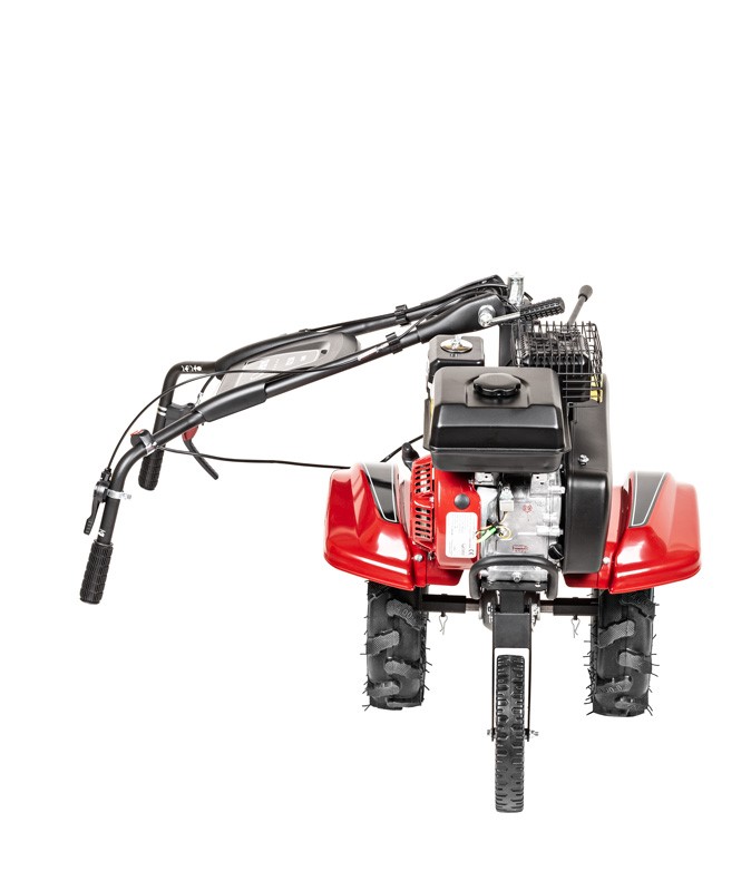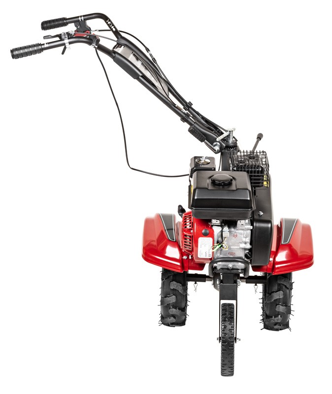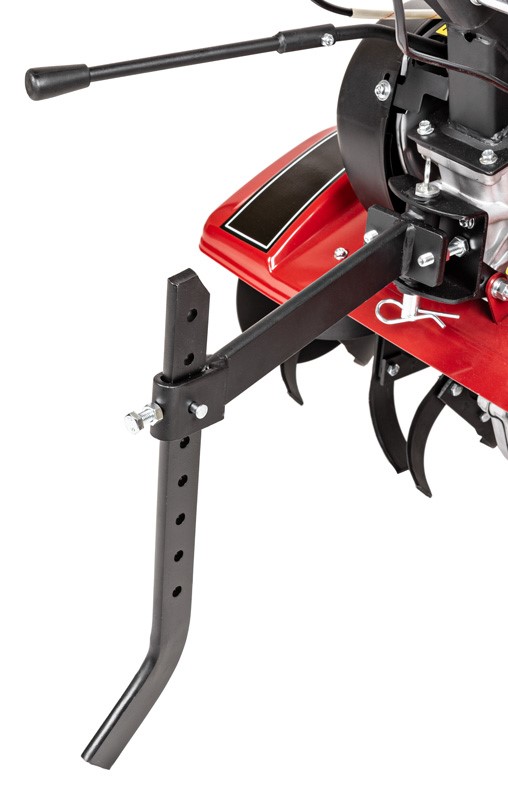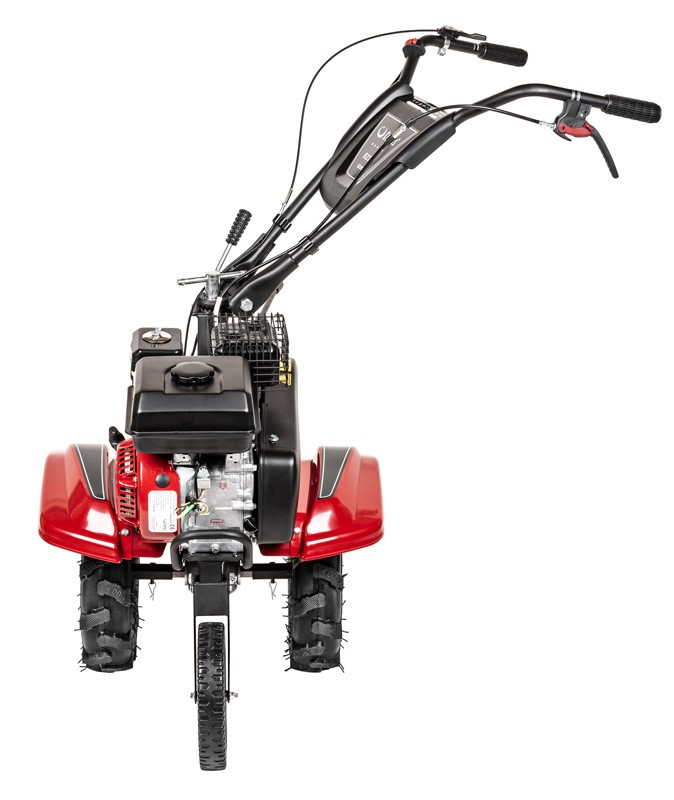 To nie tylko glebogryzarka, ale wielofunkcyjna baza pod osprzęt. Dzięki wzmocnionej przekładni i dołączonym do zestawu dużym, pompowanym kołom, maszyna może współpracować z pługiem lub obsypnikiem, stając się nieocenionym pomocnikiem przy orce czy wykopkach ziemniaków. Całość osadzona jest na sztywnej, stalowej ramie, co zapewnia stabilność i precyzję prowadzenia na obszarach do 3500 m².