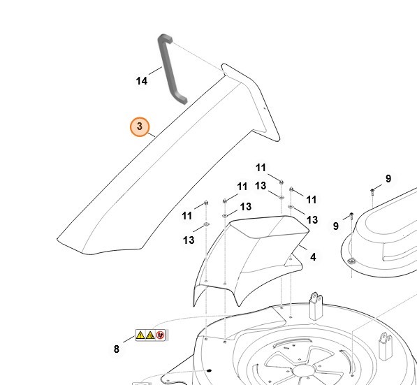 Kanał wyrzutu trawy, wyrzutnik trawy, osłona wyrzutu, discharge chute, mower chute.