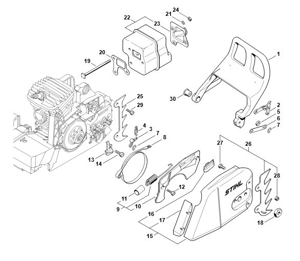 MS 390 - Hamulec łańcucha, tłumik wydechu spalin