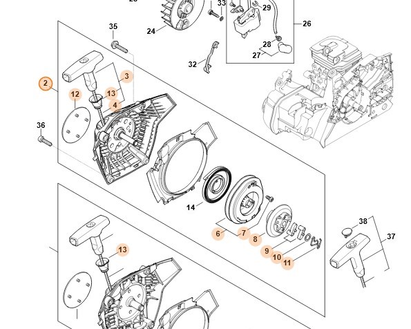 Obudowa rozrusznika, pokrywa wentylatora, starter ręczny, obudowa startera pilarki.