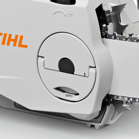 Błyskawiczny napinacz łańcucha STIHL pozwala na szybkie i beznarzędziowe napinanie piły, a przezroczyste okienko zbiornika oleju ułatwia kontrolę poziomu smarowania.