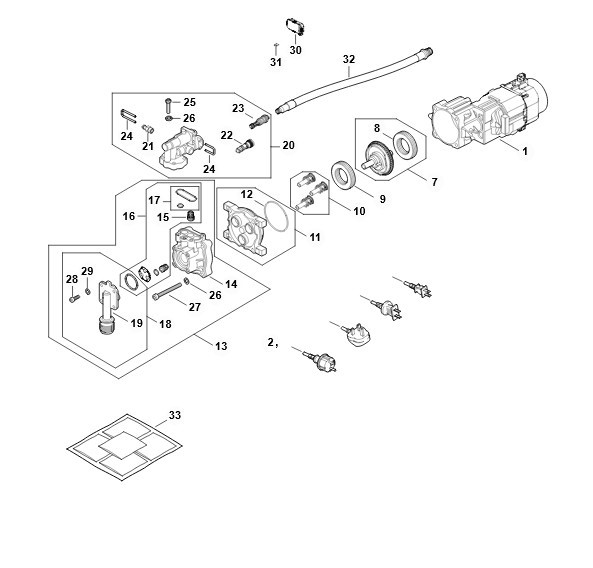 RE 100.0 PLUS CONTROL - Silnik elektryczny, Przewód przyłącza zasilania, Blok zaworowy, Pompa