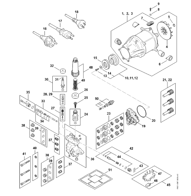 RE 150 - Silnik elektryczny, Przewód przyłącza zasilania, Blok zaworowy, Pompa RE 150