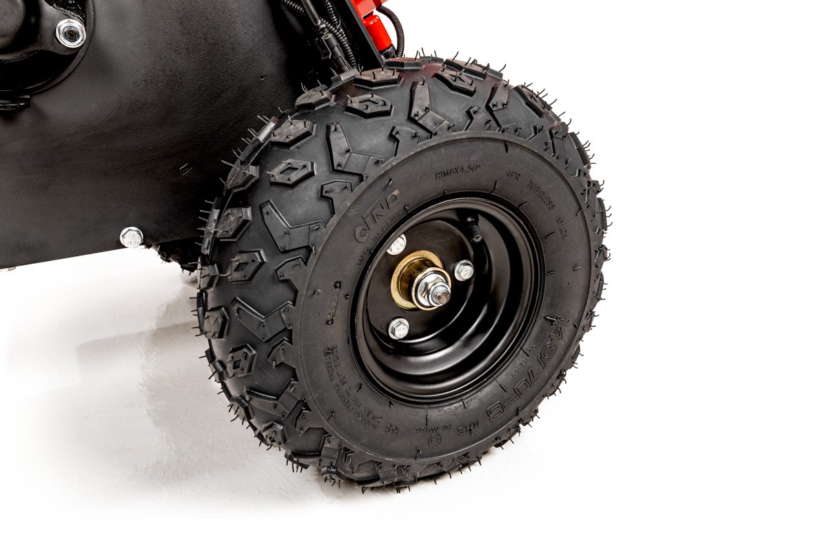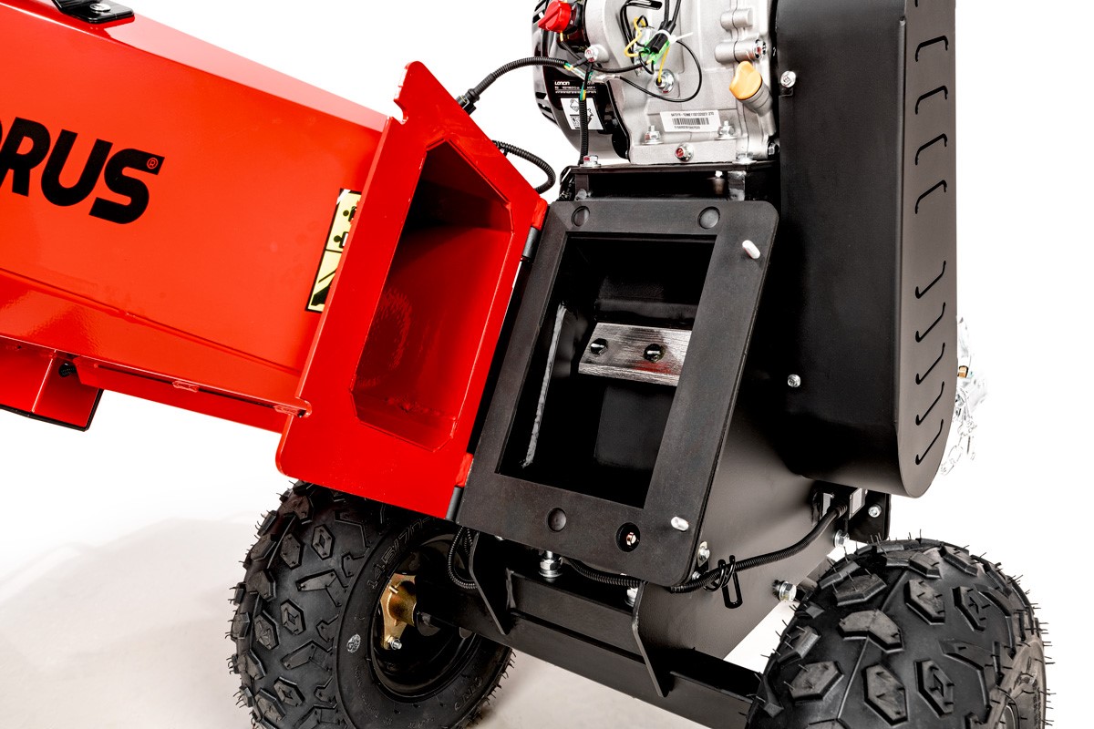 Układ tnący składa się z bębna o średnicy 350 mm wyposażonego w dwa noże robocze o długości 150 mm. Szeroki otwór podajnika (450x378 mm) ułatwia wprowadzanie rozłożystych gałęzi. Urządzenie zostało zaprojektowane z myślą o mobilności – wyposażone w duże koła i zaczep kulkowy, co umożliwia łatwy transport w miejscu pracy, jak i holowanie za pojazdem. Wymiary maszyny (2279x651x1166 mm) pozwalają na wygodne manewrowanie i przechowywanie.