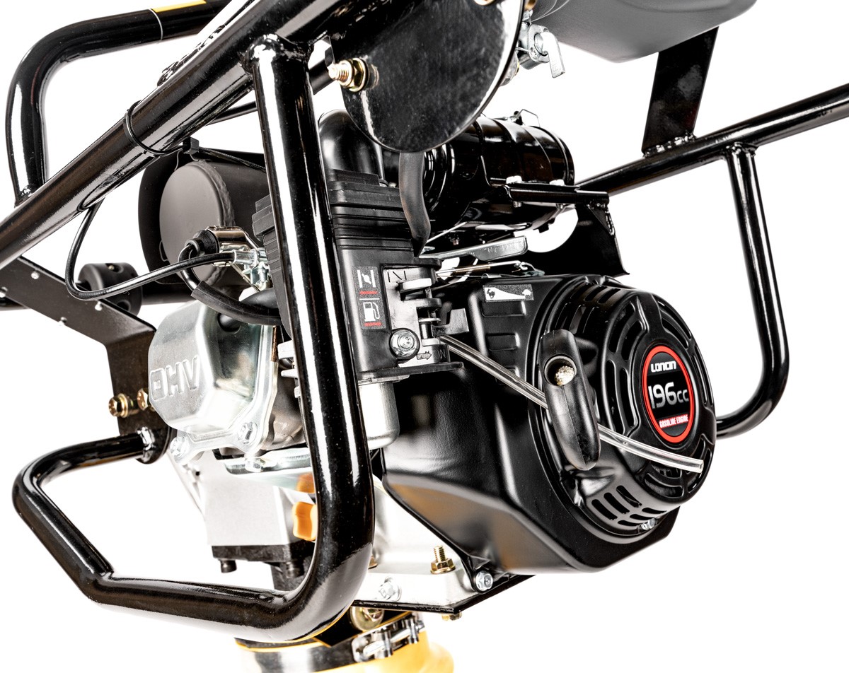 Urządzenie napędzane jest przez wysokiej klasy silnik Loncin LC168F-2H o pojemności 196 cm³. Jednostka ta generuje potężną siłę zagęszczania wynoszącą 10 kN, co przy liczbie uderzeń dochodzącej do 650 na minutę pozwala na skuteczne ubicie piasku, ziemi czy kruszywa na głębokość aż do 50 cm. Wysokość skoku rzędu 65 mm gwarantuje równomierne zagęszczenie nawet przy pracy z trudnymi, gliniastymi bryłami ziemi.