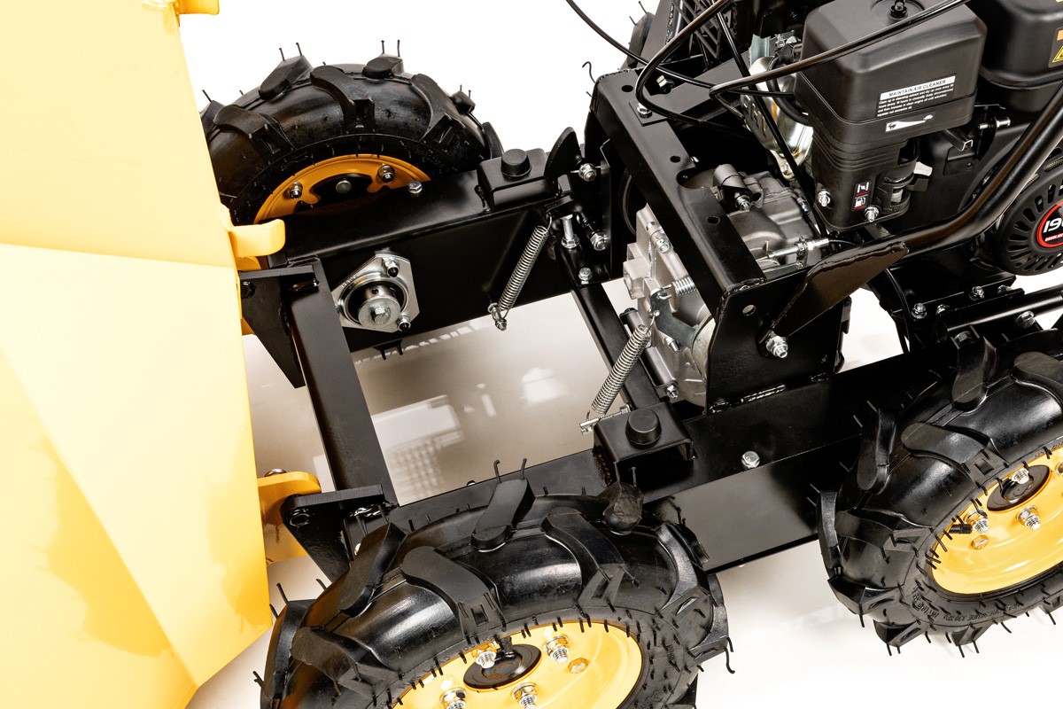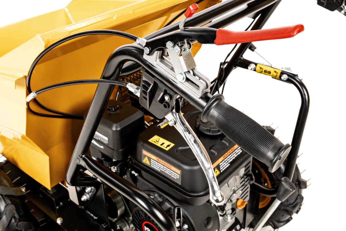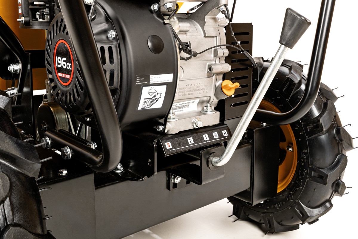 Sercem urządzenia jest sprawdzona jednostka napędowa Loncin G200F o pojemności 196 cm³ i mocy 4,1 kW. Wyjątkową sprawność w terenie gwarantuje stały napęd na cztery koła (4x4) oraz szerokie, terenowe opony z agresywnym bieżnikiem, które utrzymują przyczepność na błocie, piasku czy pochyłościach. Maszyna posiada mechaniczną skrzynię biegów oferującą 3 przełożenia do przodu oraz bieg wsteczny, co pozwala idealnie dobrać prędkość jazdy do rodzaju podłoża i ciężaru ładunku.