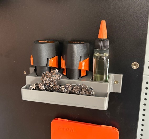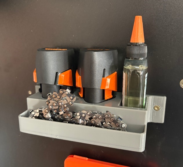 Funkcjonalny uchwyt ścienny drukowany w technologii 3D przeznaczony do przechowywania dwóch akumulatorów AS 2, buteleczki oleju bio 50 ml oraz zapasowych łańcuchów do GTA 26. To idealne rozwiązanie dla osób, które chcą utrzymać porządek w garażu, warsztacie lub domku narzędziowym i mieć wszystkie niezbędne akcesoria w jednym miejscu.