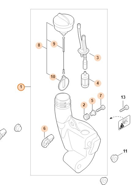 Ten **pojemnik na paliwo** jest używany podczas naprawy uszkodzonych, spuchniętych lub cieknących zbiorników w kompatybilnych podkaszarkach, nożycach do żywopłotu, krawędziarkach, silnikach Kombi i MultiSystem. Często stosowany do rozwiązywania problemów z zapachem paliwa, sączeniem się wokół zbiornika lub problemów z pracą silnika spowodowanych zasysaniem powietrza przez nieszczelność. Idealny do sezonowego serwisowania i przywracania sprawności używanym maszynom.